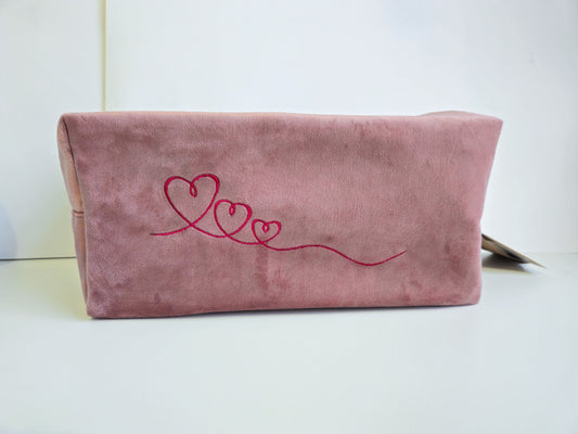 XL Velvet Pouch with Trio of Hearts Embroidery | Sustainable Makeup or Travel Pouch | Luxurious dusty pink | Recycled polyester