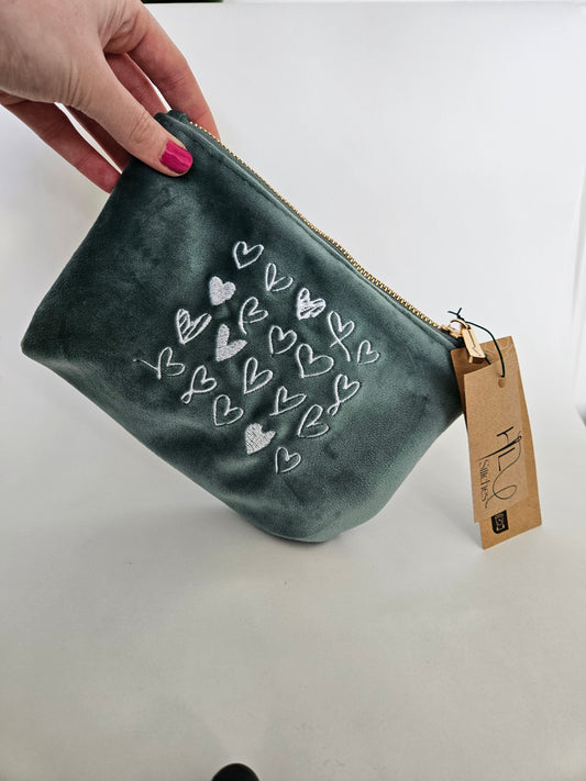 Recycled Velvet White Heart Pouch SMALL | Sustainable Makeup or Travel Pouch | Luxurious Feel