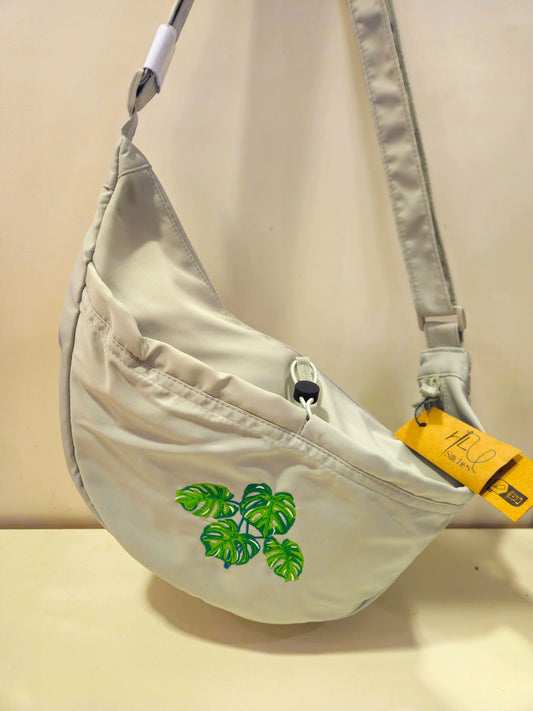 Sage Green Cross-Body Bag | Recycled Polyester Eco Conscious | Variegated Monstera Leaf Embroidery | 12L Capacity | Water repellent
