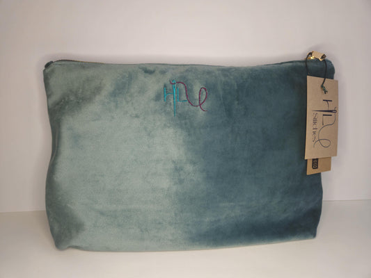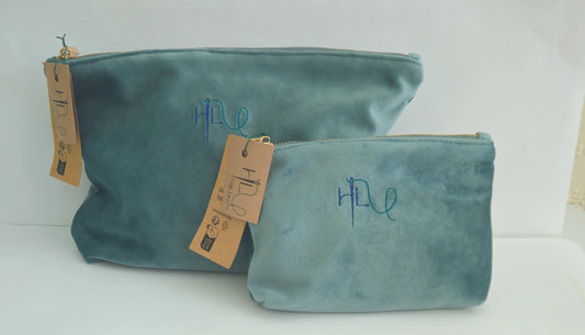 Eco-Friendly Velvet Makeup Bag Pouch | 'Bits and Bobs' Embroidered | Travel Case | Luxurious | Choice of blue, green or sage | Recycled