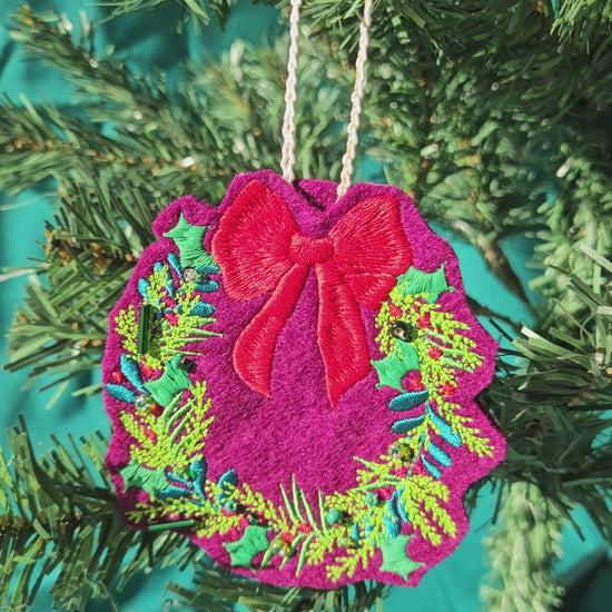 Featuring a bold red embroidered bow and a lush mix of greenery and holly details, this decoration is perfect for hanging on your Christmas tree, mantel, or gift wrapping for a personal handmade touch.